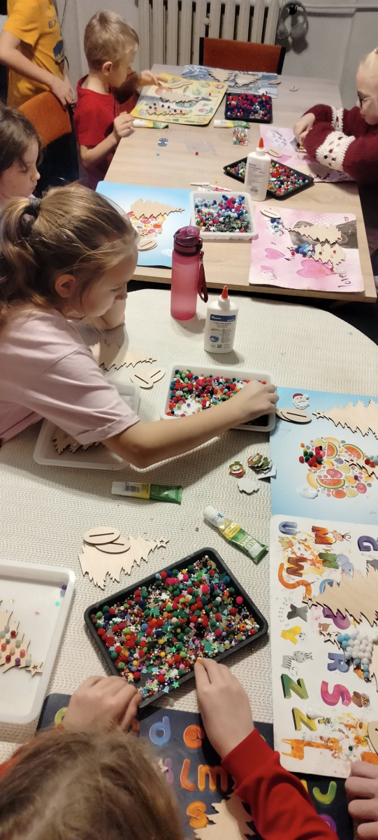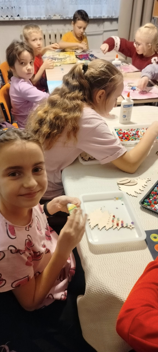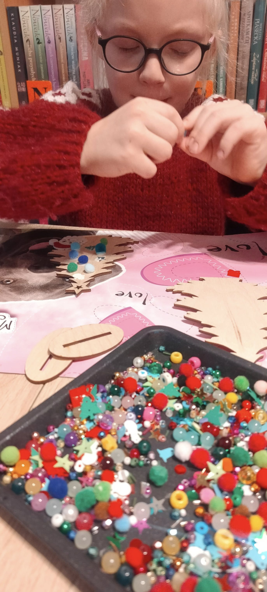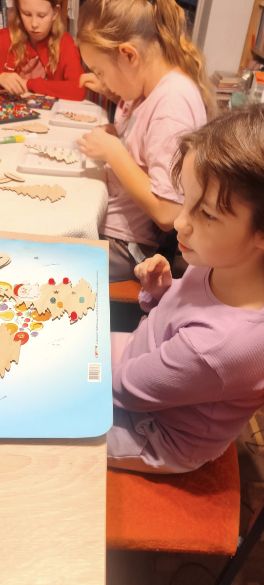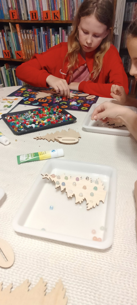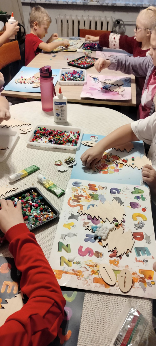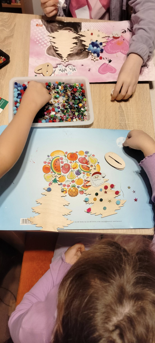 Dzisiejsze spotkanie upłynęło nam w świątecznej atmosferze. Podczas warsztatów dzieci własnoręcznie ozdobiły drewniane choinki, które zagoszczą w ich domach.