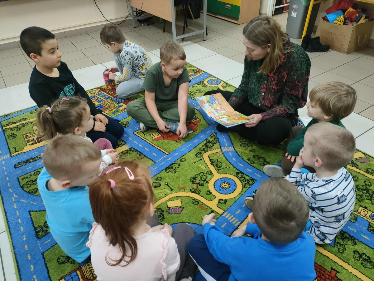 Dzieci z dużą uwagą wysłuchały opowiadania o Kubusiu Puchatku pt. "Wiej, wietrze, wiej!". To było wietrzne opowiadanie. Przedszkolaki opowiadały co robił wiatr w Stumilowym Lesie.
