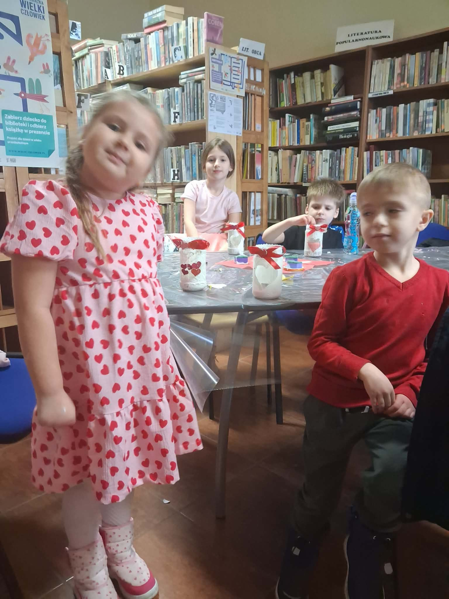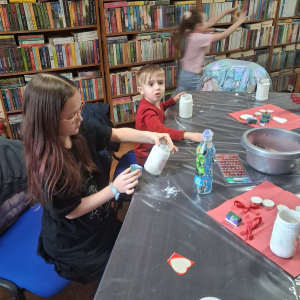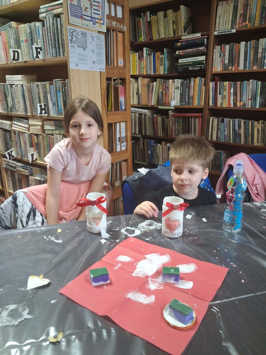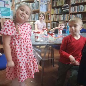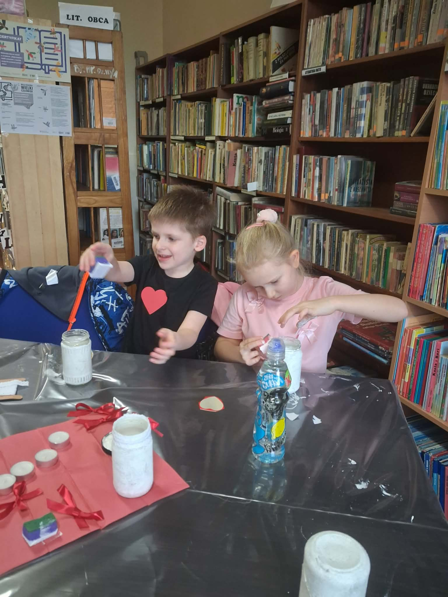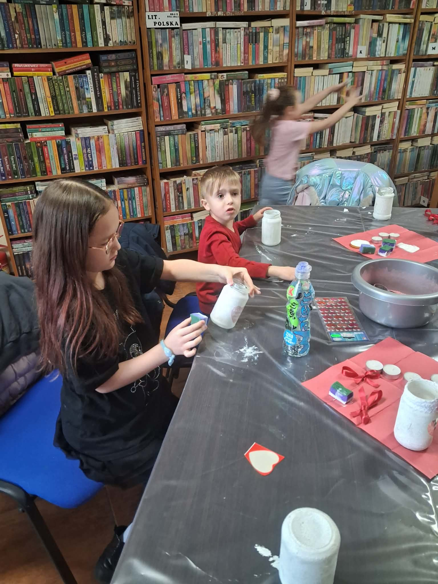 11.02 w filii Młodojewie odbyły się walentynkowe warsztaty, które wprowadziły nas w ciepłą i miłą atmosferę. Lampiony walentynkowe wykonane przez dzieci powstały z pomalowanych przez nie słoików. Dzieci z ogromnym zaangażowaniem malowały szkło białą farbą. Uczestnicy warsztatów tworzyli serduszka, własne i kreatywne kompozycje na słoikach.