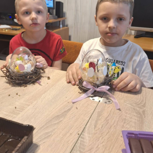 Podczas spotkania uczestnicy mieli okazję własnoręcznie przygotować wyjątkowe dekoracje umieszczone w plastikowych jajkach. Każde z nich stało się małą, zamkniętą kompozycją – pełną kolorów, symboli wiosny i indywidualnych pomysłów. Dzieci wykorzystywały różnorodne materiały plastyczne: barwne piórka, wstążki, kwiaty oraz drobne ozdoby, tworząc niepowtarzalne, świąteczne miniatury.